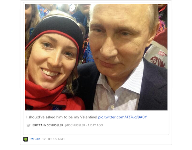 Russian president Vladimir Putin stopped by the USA and Canada Houses in Sochi on Friday, drawing plenty of attention from smartphone-wielding athletes. One of them was Canadian speedskater Brittany Schussler, who took advantage of her proximity to Putin to snap a selfie.