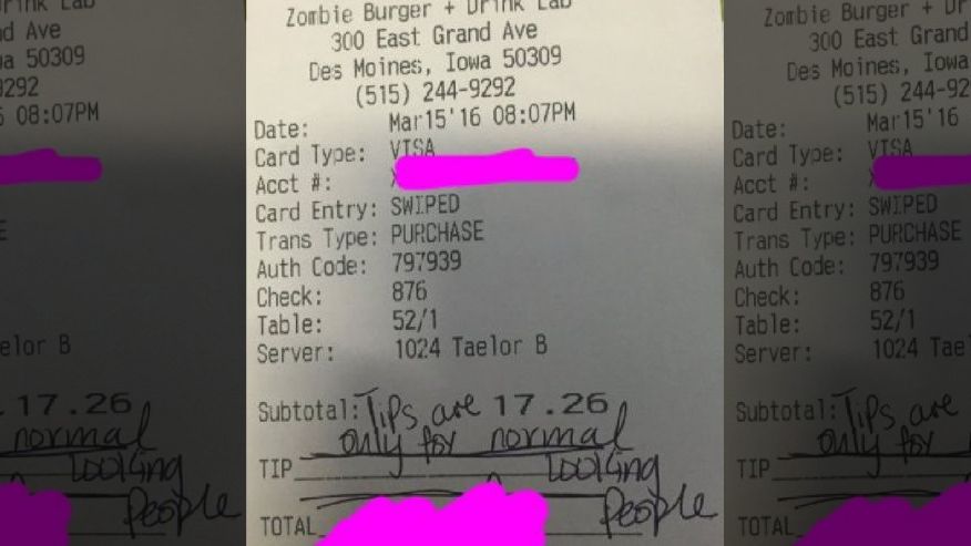 People like these cheap bastards that stiffed this waitress should not go out to eat. What kind of server do they expect to see in a place called Zombie Burger. Servers all over the world depend on their tips to make a living.