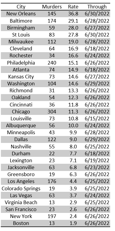 Cities with the highest murders per capita so far in 2022 include New Orleans, Baltimore, Birmingham, St. Louis, Milwaukee, Cleveland and others
