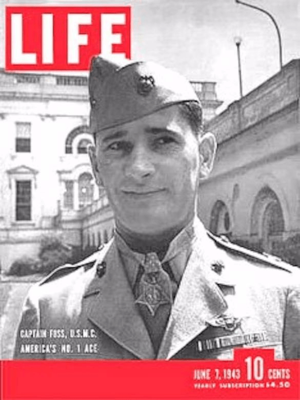“For outstanding heroism and courage above and beyond the call of duty as executive officer of Marine Fighting Squadron 121, 1st Marine Aircraft Wing, at Guadalcanal. Engaging in almost daily combat with the enemy from 9 October to 19 November 1942, Capt. Foss personally shot down 23 Japanese planes and damaged others so severely that their destruction was extremely probable. In addition, during this period, he successfully led a large number of escort missions, skillfully covering reconnaissance, bombing, and photographic planes as well as surface craft. On 15 January 1943, he added 3 more enemy planes to his already brilliant successes for a record of aerial combat achievement unsurpassed in this war. Boldly searching out an approaching enemy force on 25 January, Capt. Foss led his 8 F-4F Marine planes and 4 Army P-38’s into action and, undaunted by tremendously superior numbers, intercepted and struck with such force that 4 Japanese fighters were shot down and the bombers were turned back without releasing a single bomb. His remarkable flying skill, inspiring leadership, and indomitable fighting spirit were distinctive factors in the defense of strategic American positions on Guadalcanal.”