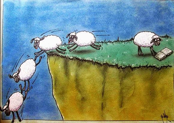 They are the robotic sheep jumping off the Cliff because the one in front of them is doing it.They are pathetic and do not have a mind of their own.